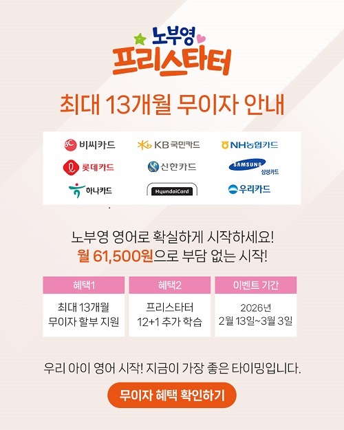 헬로 노부영 베이비부터 발화 집중과 기초 파닉스까지, 우리 아이에게 꼭 맞는 프로그램으로 영어 자신감을 키워주세요.